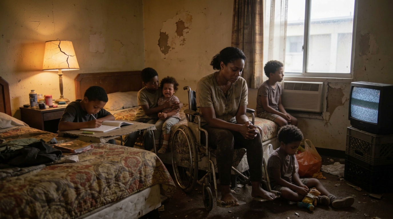 Veronica, a stroke victim, and her kids were staying in a dangerous motel on Rivers Avenue. Prostitutes, drunks, and drug users filled the neighboring rooms. Veronica kept the outside door locked and the curtains drawn. The kids were afraid to go to school and spent every day crammed into a dark room with only two beds (some slept on the floor). In earlier years, Veronica had a job cleaning schools. Now she was paralyzed from the waist down and destitute.